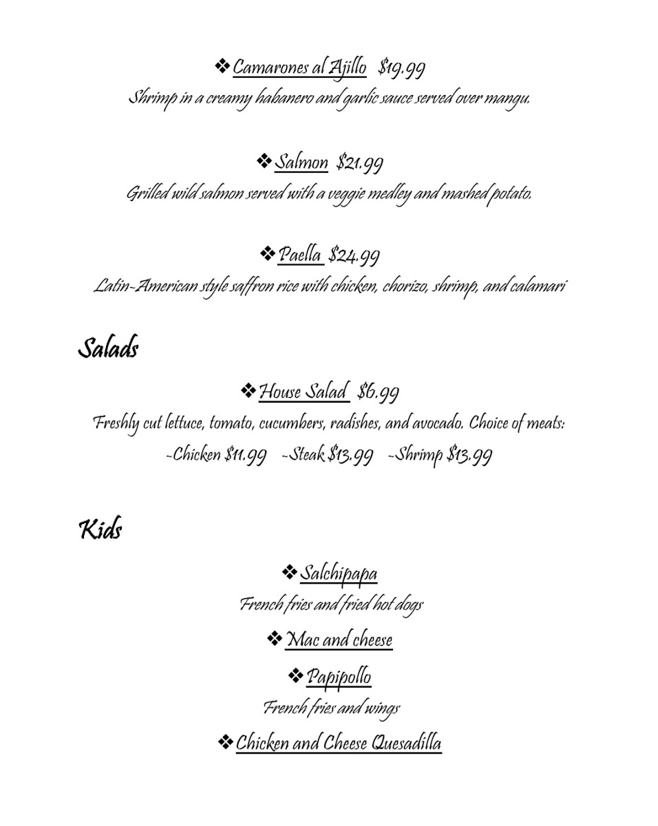 Pollo, Steak, and Shrimp served with white rice, pico de gallo, lettuce salad, refried beans, and flour tortillas.